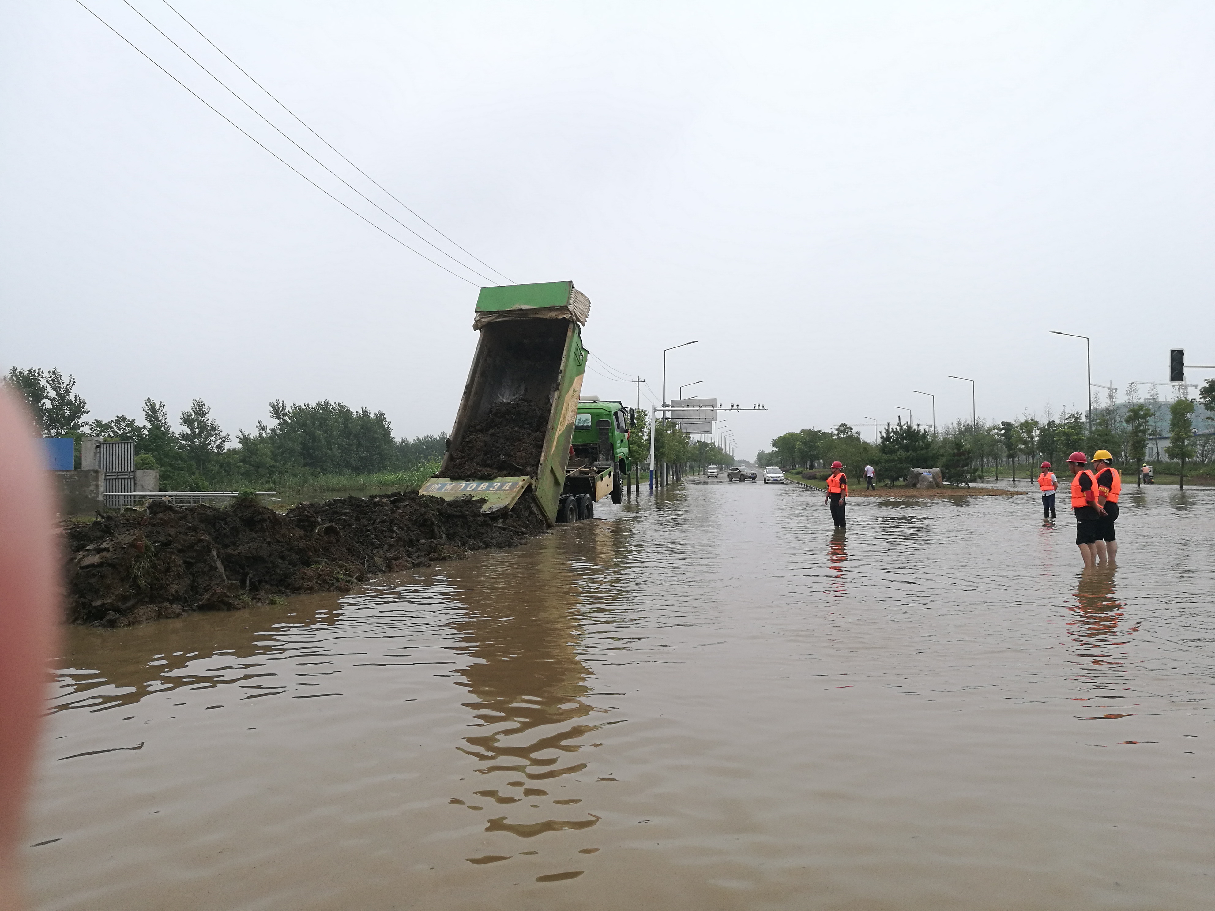 7月21日8:20分,由于花園水庫(kù)水位過高、排水不暢積水嚴(yán)重,導(dǎo)致縣內(nèi)經(jīng)三路與傳塘路交口處交通中斷,突擊隊(duì)接到全椒縣防汛指揮部命令后,迅速集結(jié),調(diào)用32名人員、16臺(tái)套設(shè)備、近千條編織袋,經(jīng)過近10個(gè)小時(shí)的奮戰(zhàn),于21日下午六時(shí)恢復(fù)交通。