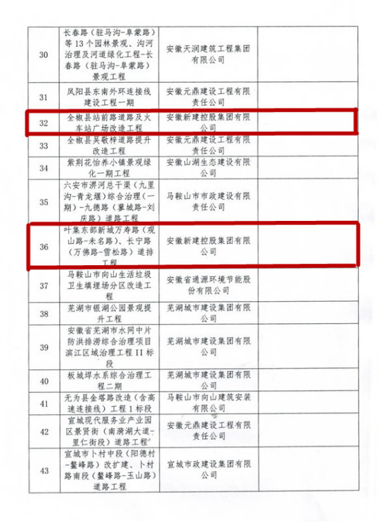 2020年12月29日,根據(jù)《安徽省市政工程優(yōu)質(zhì)獎評選辦法(試行)》(市政協(xié)會秘字【2019】27號)和《關(guān)于開展2020年度安徽省市政工程優(yōu)質(zhì)獎評審工作的通知》要求,在協(xié)會組織開展評選活動中,經(jīng)形式審查、現(xiàn)場復核、專家評審委員會審定,由安徽新建控股集團有限公司施工的全椒縣站前路道路及火車站廣場改造工程、岳西縣店前濱河新區(qū)店前河綜合治理建設項目3標段、葉集東部新城萬壽路(觀山路-未名路)、長寧路(萬佛路-雪松路)道排工程,三項工程榮獲“2020年度安徽省市政工程優(yōu)質(zhì)獎”!