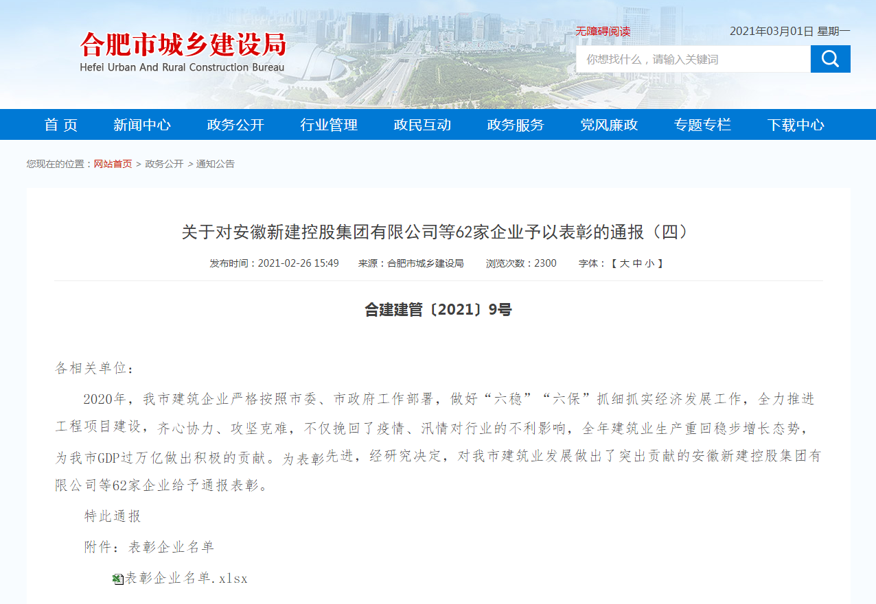 2月26日,合肥市城鄉(xiāng)建設(shè)局印發(fā)《關(guān)于對(duì)安徽新建控股集團(tuán)有限公司等62家企業(yè)予以表彰的通報(bào)(四)》(合建建管[2021]9號(hào))紅頭文件,對(duì)安徽新建控股集團(tuán)有限公司等62家企業(yè)在2020年面對(duì)疫情、汛期的不利影響,全力推進(jìn)工程項(xiàng)目建設(shè),為我市GDP過(guò)萬(wàn)億做出的積極貢獻(xiàn)進(jìn)行通報(bào)表彰,安徽新建控股集團(tuán)有限公司在該批次表彰中名列榜首。
