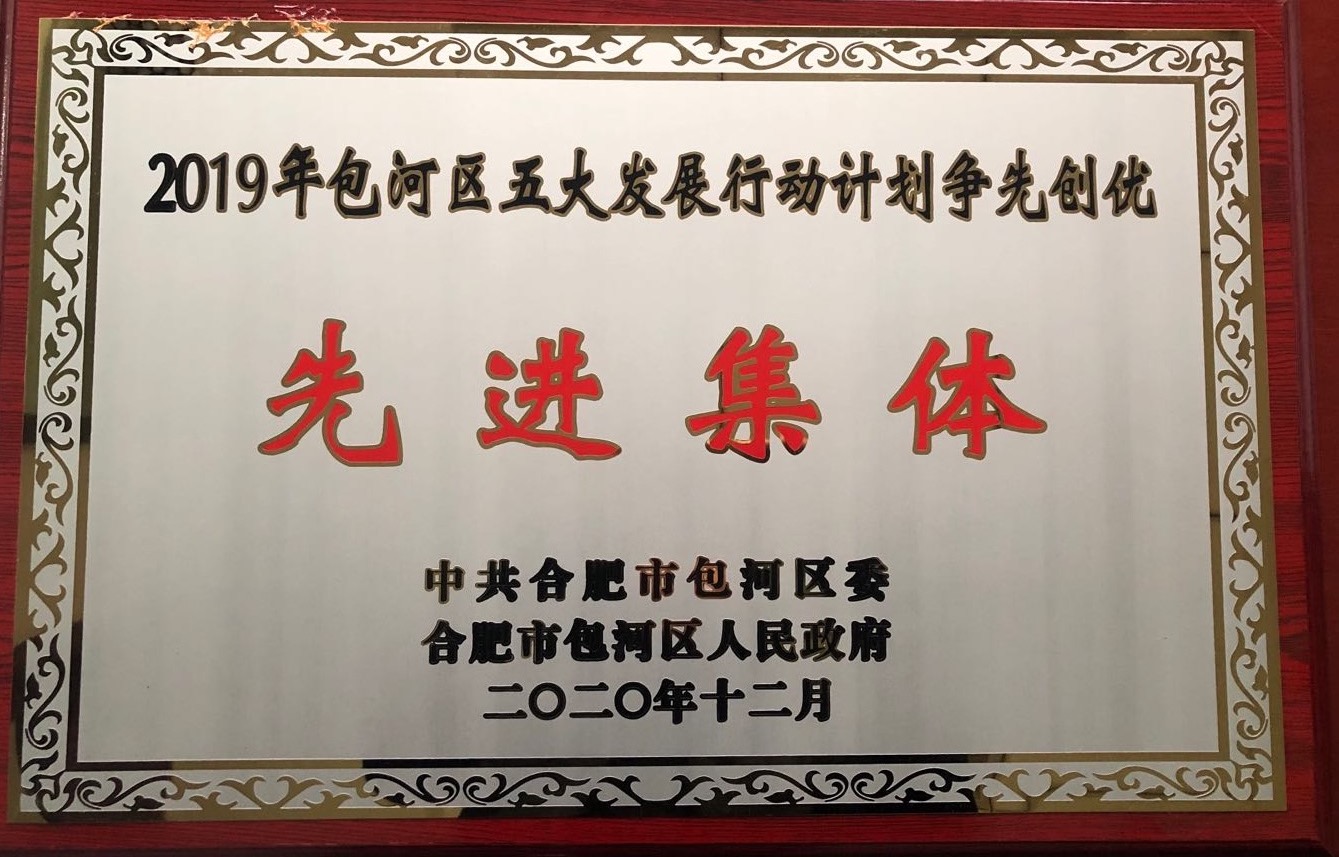熱烈祝賀我公司榮獲“2019年包河區(qū)五大發(fā)展行動(dòng)計(jì)劃爭(zhēng)先創(chuàng)優(yōu)”先進(jìn)集體稱號(hào)