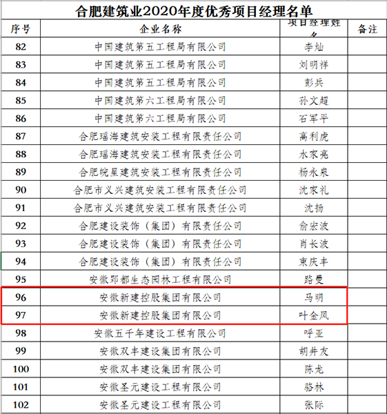 近日,合肥市建筑工程協(xié)會(huì)發(fā)布通知,合肥建筑業(yè)2020年度評(píng)優(yōu)評(píng)先工作已全面完成,獲獎(jiǎng)單位頒發(fā)領(lǐng)取榮譽(yù)證書。安徽新建控股集團(tuán)公司榮獲合肥建筑業(yè)2020年度質(zhì)量管理先進(jìn)企業(yè)、合肥建筑業(yè)2020年度優(yōu)秀施工企業(yè)等2項(xiàng)榮譽(yù)。同時(shí),集團(tuán)公司馬明、葉金鳳也被授予合肥建筑業(yè)2020年度優(yōu)秀項(xiàng)目經(jīng)理,丁康被授予合肥建筑業(yè)2020年度揚(yáng)塵治理先進(jìn)個(gè)人。