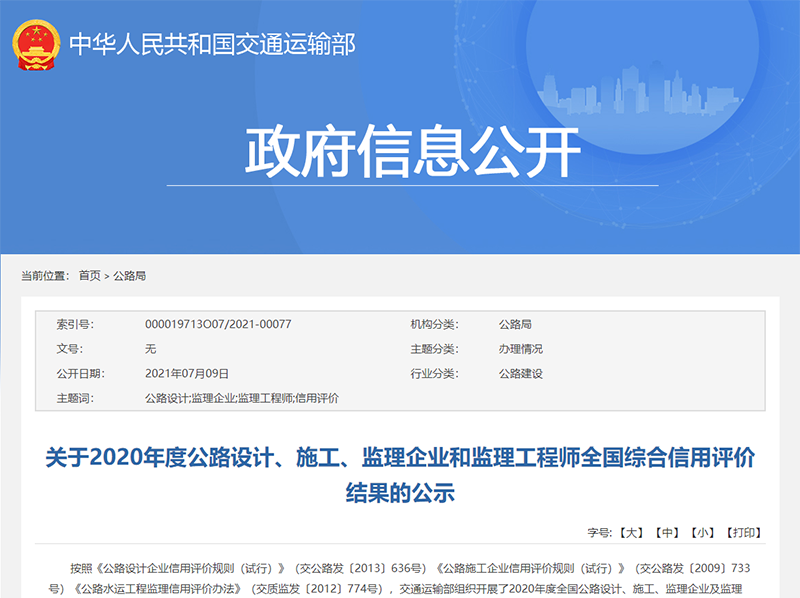 近日,交通運(yùn)輸部發(fā)布了《2020年度公路設(shè)計(jì)、施工、監(jiān)理企業(yè)和監(jiān)理工程師全國(guó)綜合信用評(píng)價(jià)結(jié)果的公示》,安徽新建控股集團(tuán)既2019年度后再次榮獲公路施工企業(yè)信用評(píng)價(jià)最高等級(jí)——AA級(jí)。