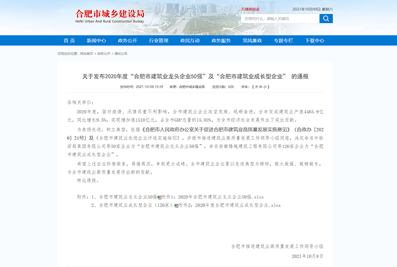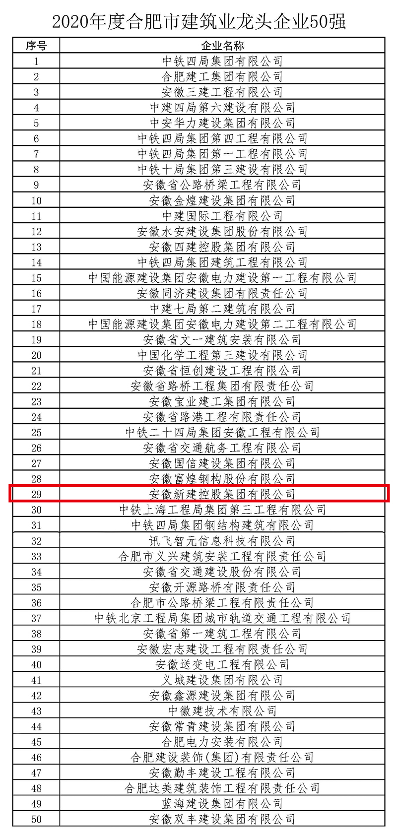 10月8日,合肥市城鄉(xiāng)建設(shè)局網(wǎng)站發(fā)布2020年度“合肥市建筑業(yè)龍頭企業(yè)50強(qiáng)”的通報(bào),安徽新建控股集團(tuán)榮獲2020合肥建筑業(yè)龍頭企業(yè)第29名。