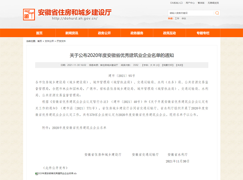11月30日,安徽省住房和城鄉(xiāng)建設(shè)廳網(wǎng)站發(fā)布《關(guān)于公布2020年度安徽省優(yōu)秀建筑業(yè)企業(yè)名單的通知》,安徽新建控股集團獲評“2020年度安徽省優(yōu)秀建筑業(yè)企業(yè)”,殊榮實至名歸!成績可喜可賀!