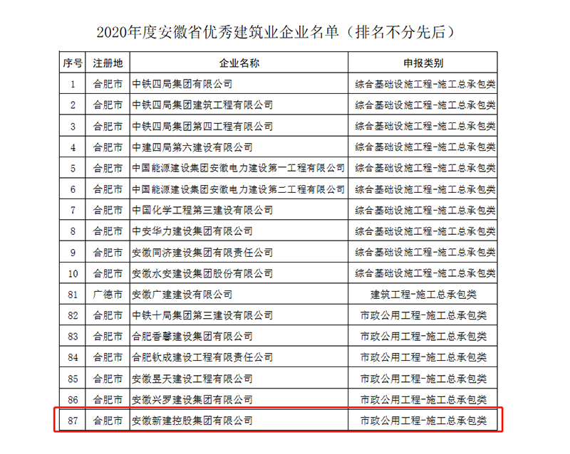 此次2020年度安徽省優(yōu)秀建筑業(yè)企業(yè)認(rèn)定,由安徽省住房城鄉(xiāng)建設(shè)廳會同省交通運輸廳、省水利廳組織開展,目的是為了進一步發(fā)揮全省優(yōu)秀建筑業(yè)企業(yè)的引領(lǐng)帶動作用,鍛造和打響“安徽建造”品牌,推動我省建筑業(yè)高質(zhì)量發(fā)展。本次認(rèn)定全省共有379家企業(yè)榜上有名。