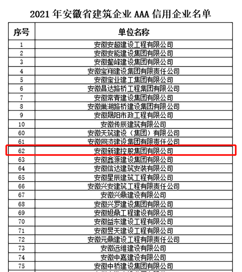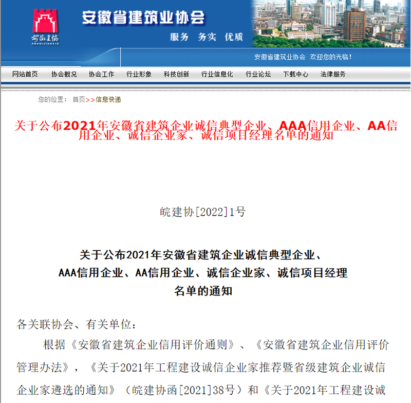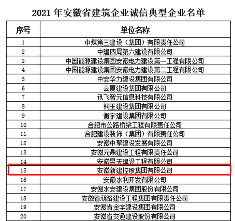 1月5日,安徽省建筑業(yè)協(xié)會(huì)分別公布了2021年安徽省建筑企業(yè)誠(chéng)信典型企業(yè)、AAA信用企業(yè)評(píng)價(jià)結(jié)果,安徽新建控股集團(tuán)憑借卓越的服務(wù)質(zhì)量、品牌認(rèn)知度和良好的社會(huì)信譽(yù)獲評(píng)“安徽省建筑企業(yè)誠(chéng)信典型企業(yè)”和“AAA信用企業(yè)”兩項(xiàng)殊榮。