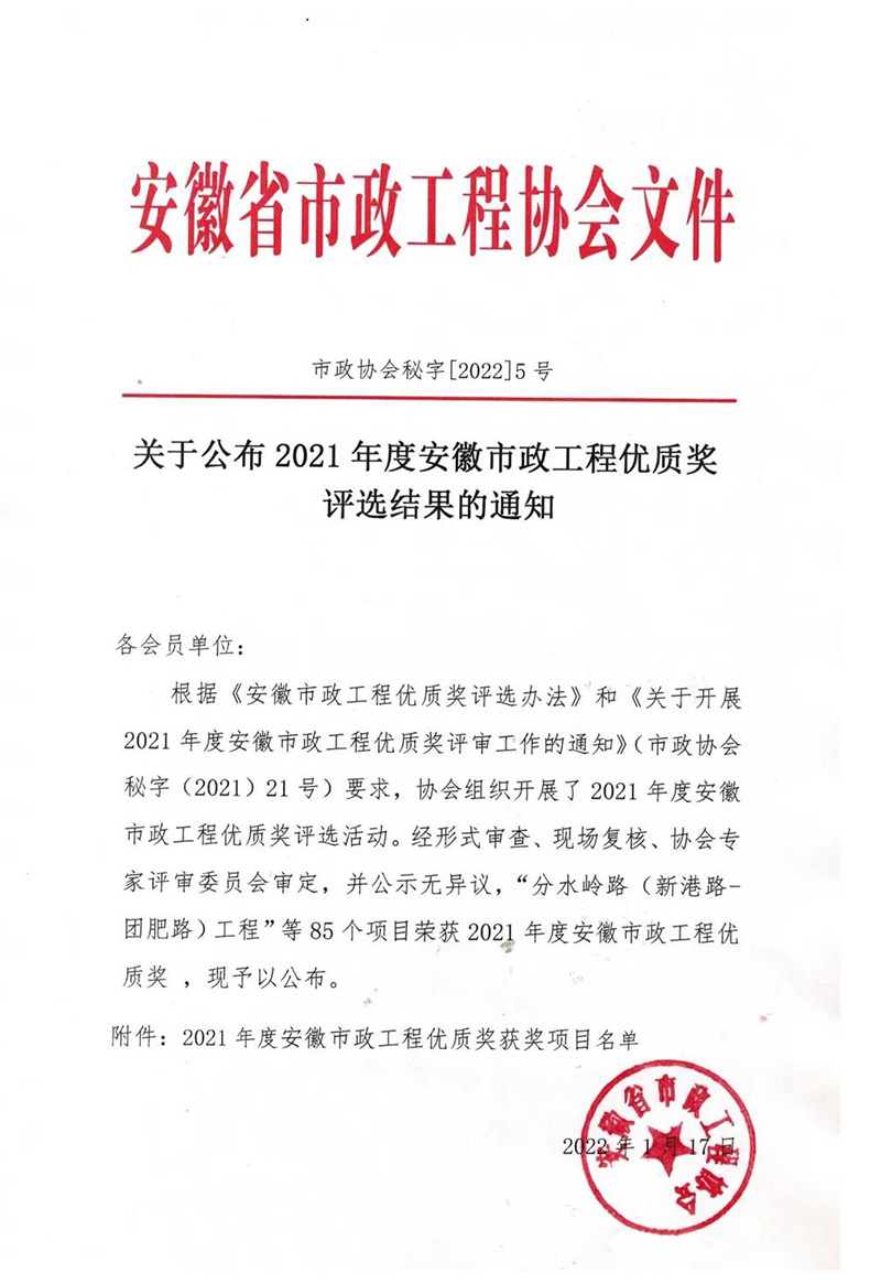 2022年1月17日,安徽省市政工程協(xié)會公布了2021年度安徽省市政工程優(yōu)質(zhì)獎評選結(jié)果的通知,經(jīng)形式審查、現(xiàn)場復(fù)核、協(xié)會專家評審委員會審定,并公示無異議,安徽新建控股集團(tuán)有限公司承建的四項(xiàng)工程榮獲“2020年度安徽省市政工程優(yōu)質(zhì)獎”!