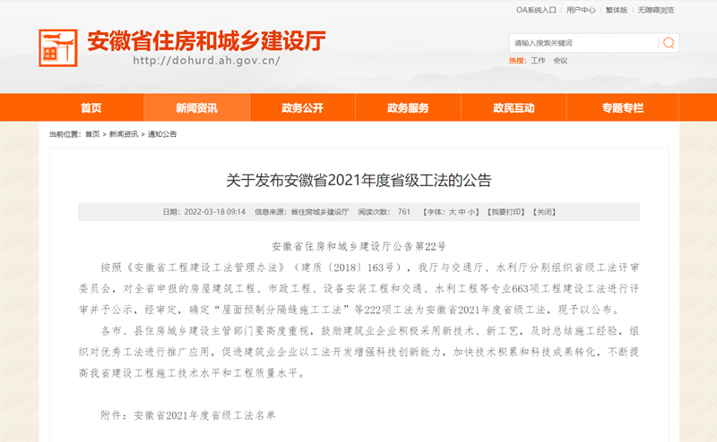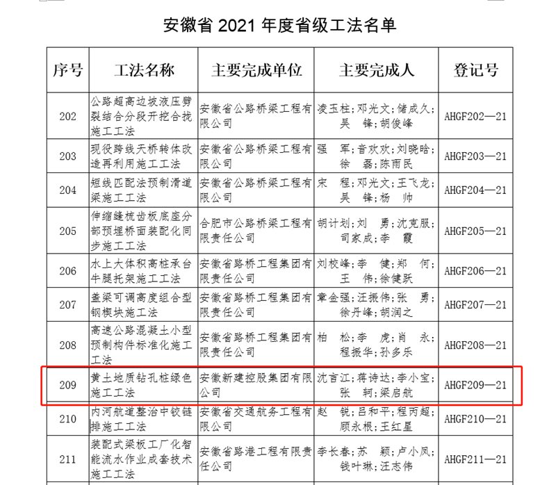 3月18日,安徽省住房和城鄉(xiāng)建設廳發(fā)布公告,按照《安徽省工程建設工法管理辦法》,經(jīng)省級工法評審委員會審定,新建集團申報的一項“黃土地質鉆孔樁綠色施工工法AHGF209—21”成功獲得安徽省2021年度省級工法認證。