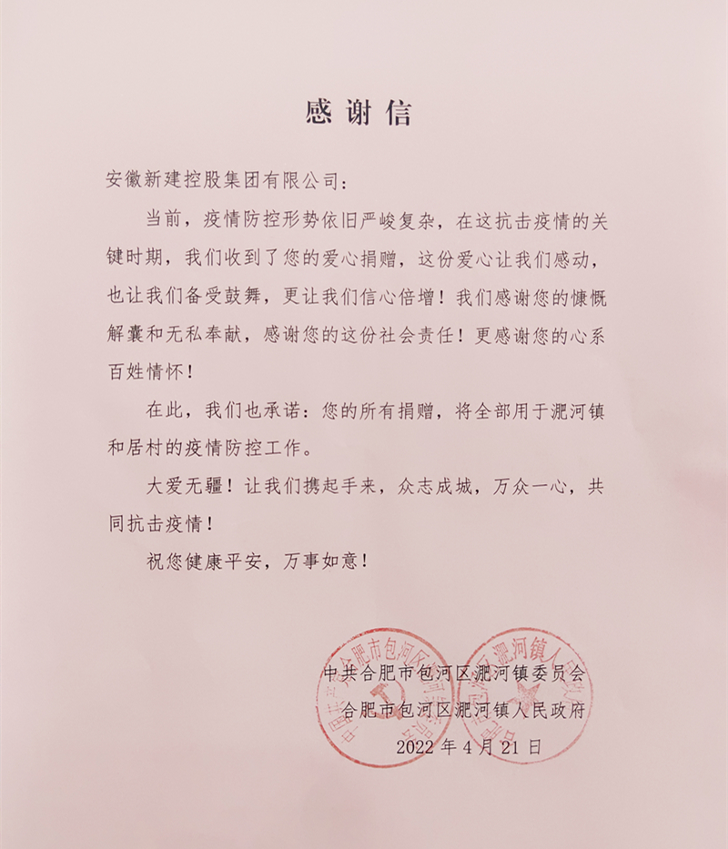 活動(dòng)結(jié)束后,淝河鎮(zhèn)黨委、淝河鎮(zhèn)人民政府向集團(tuán)公司發(fā)來(lái)感謝信。感謝信內(nèi)容如下: