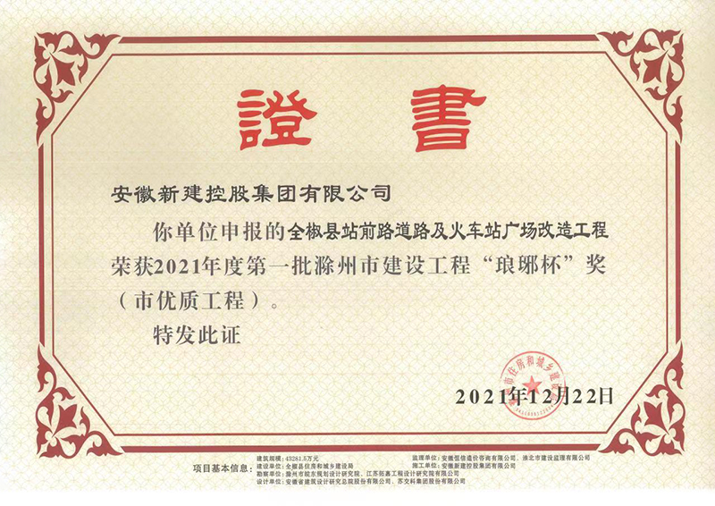 近日,集團公司收到由安徽省滁州市住房和城鄉(xiāng)建設(shè)局頒發(fā)的證書,公司承建的全椒縣站前路道路及火車站廣場改造工程榮獲2021年度第一批滁州市建設(shè)工程“瑯琊杯”獎(市優(yōu)質(zhì)工程)。
