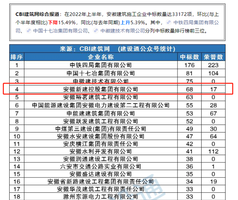 7月20日,CBI建筑網(wǎng)綜合報(bào)道發(fā)布《安徽2022上半年建企中標(biāo)100強(qiáng)》,在2022年上半年,安徽建筑施工企業(yè)中標(biāo)數(shù)量達(dá)33172項(xiàng),環(huán)比(與上個(gè)半年度相比)下降15.49%,同比(與去年同期)上升5.39%。其中安徽新建控股集團(tuán)有限公司位列中標(biāo)數(shù)量排行榜第四,穩(wěn)居前位。