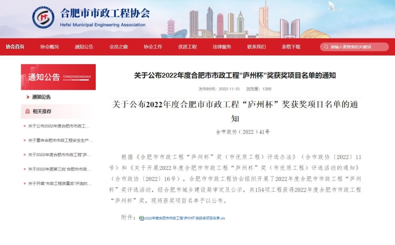 11月15日,合肥市市政工程協(xié)會網(wǎng)站發(fā)布《關(guān)于公布2022年度合肥市市政工程“廬州杯”獎獲獎項(xiàng)目名單的通知》,安徽新建承建三項(xiàng)市政工程喜獲2022年度合肥市市政工程“廬州杯”獎。