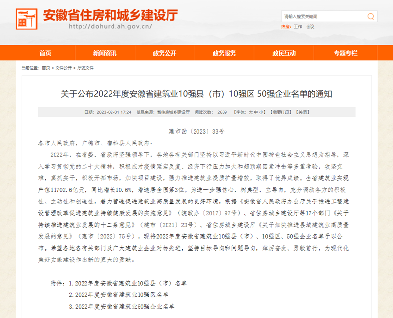 近日,安徽省住建廳公布了2022年度安徽省建筑業(yè)50強(qiáng)企業(yè)名單,安徽新建控股集團(tuán)憑借深厚的綜合實(shí)力再次榮登安徽省建筑業(yè)50強(qiáng)榜單,排序第35位。