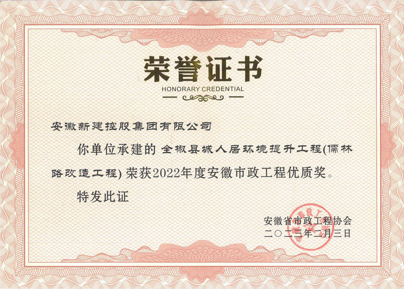 日前,安徽省市政工程協(xié)會頒發(fā)了2022年度安徽市政工程優(yōu)質(zhì)獎獲獎項目榮譽證書,集團公司承建的廬江縣左慈路青蓮路工程、全椒縣城人居環(huán)境提升工程兩項項目均獲市政工程優(yōu)質(zhì)獎。