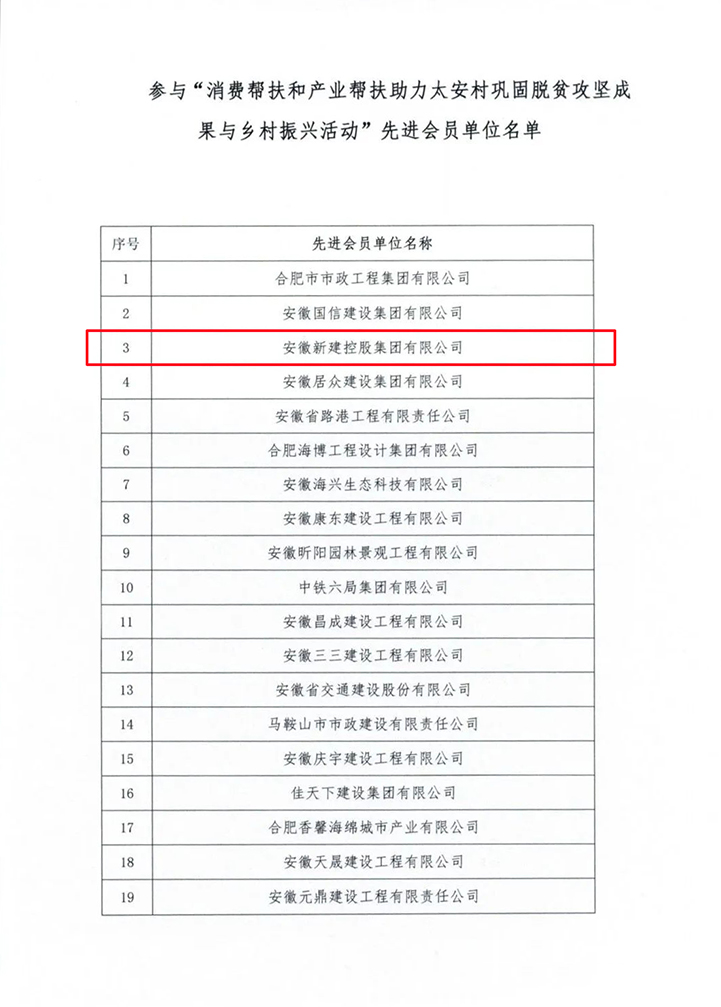 近日,安徽省市政工程協(xié)會發(fā)布關(guān)于表彰參與“消費幫扶和產(chǎn)業(yè)幫扶助力太安村鞏固脫貧攻堅成果與鄉(xiāng)村振興活動”先進會員單位的通報。表彰安徽新建控股集團在內(nèi)的三百家企業(yè),積極參與了太安村鞏固脫貧攻堅成果與鄉(xiāng)村振興活動,以實際行動履行社會責任。