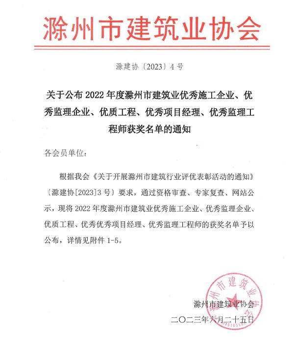 2023年6月25日,滁州市建筑業(yè)協(xié)會發(fā)布《關(guān)于公布2022年度滁州市建筑業(yè)優(yōu)秀施工企業(yè)、優(yōu)秀監(jiān)理企業(yè)、優(yōu)秀工程、優(yōu)秀項目經(jīng)理、優(yōu)秀監(jiān)理工程師獲獎名單的通知》,集團公司被評為2022年度滁州市建筑業(yè)優(yōu)秀施工企業(yè),公司承建的濠州路、淮河大道和郭圩路三條道路延伸段工程被評為2022年度滁州市建筑業(yè)優(yōu)質(zhì)工程。