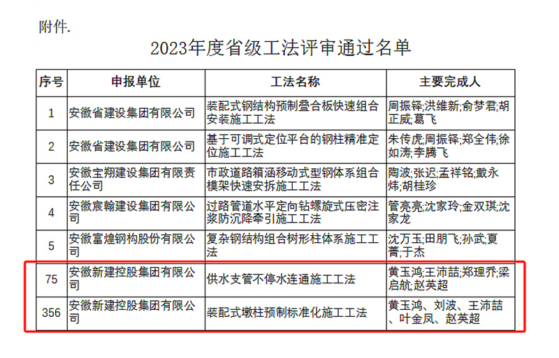 近日,安徽省住房和城鄉(xiāng)建設(shè)廳公布了2023年度省級工法名單,集團(tuán)公司申報的《裝配式梁組合封閉箍筋施工工法》、《供水支管不停水連通施工工法》等2項工法獲評安徽省省級工法。