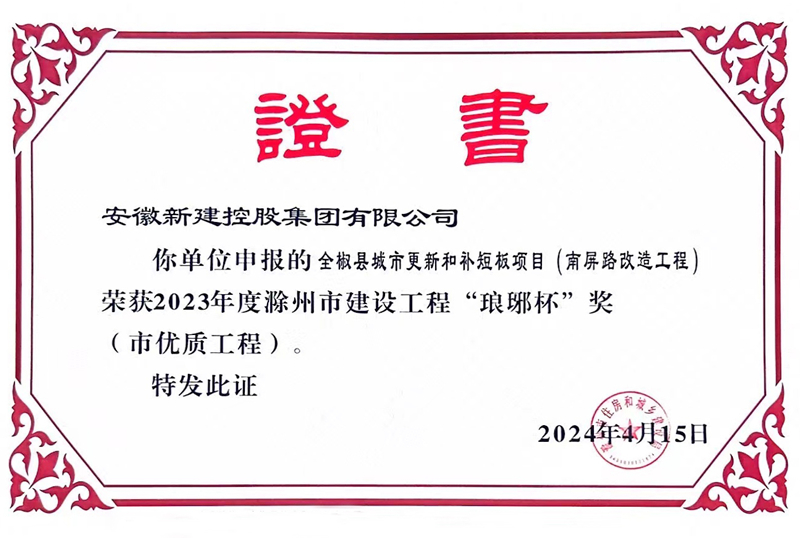近日,集團(tuán)公司收到由安徽省滁州市住房和城鄉(xiāng)建設(shè)局頒發(fā)的證書,公司承建的全椒縣城市更新和補(bǔ)短板項目(南屏路改造工程)榮獲2023年度滁州市建設(shè)工程“瑯琊杯”獎(市優(yōu)質(zhì)工程)。