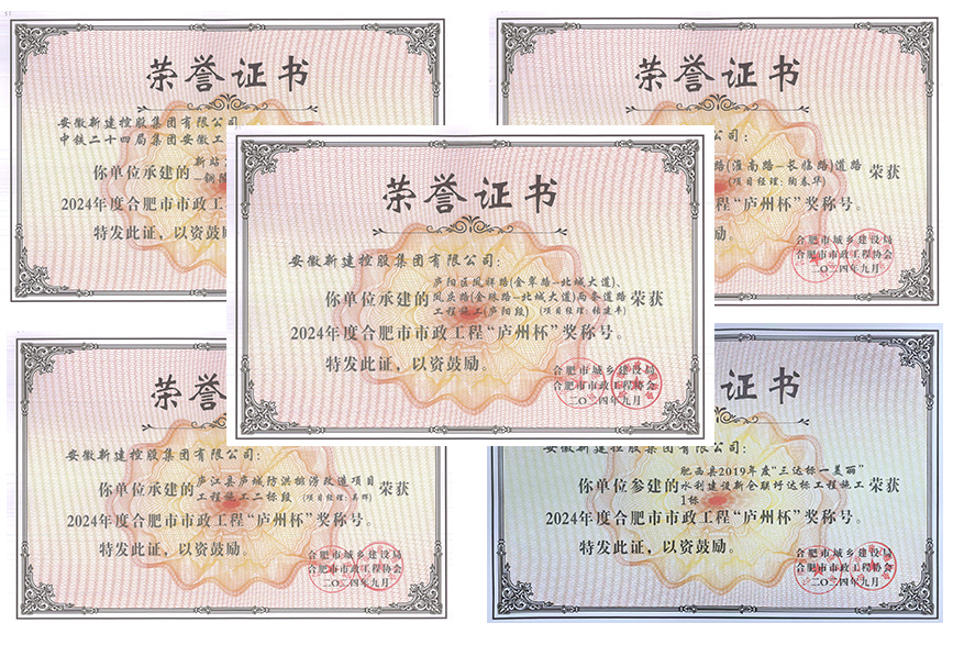 本次獲獎工程分別為:廬江縣廬城防洪排澇改造項目工程施工二標(biāo)段,廬陽區(qū)鳳祥路(金翠路-北城大道)、鳳慶路(金珠路-北城大道)兩條道路工程施工(廬陽段),新站高新區(qū)珠城東路(大禹路-銅陵北路),姑山路(淮南路-長臨路)道路工程,肥西縣2019年度“三達標(biāo)一美麗”水利建設(shè)新倉聯(lián)圩達標(biāo)工程施工1標(biāo)等五項建設(shè)工程。