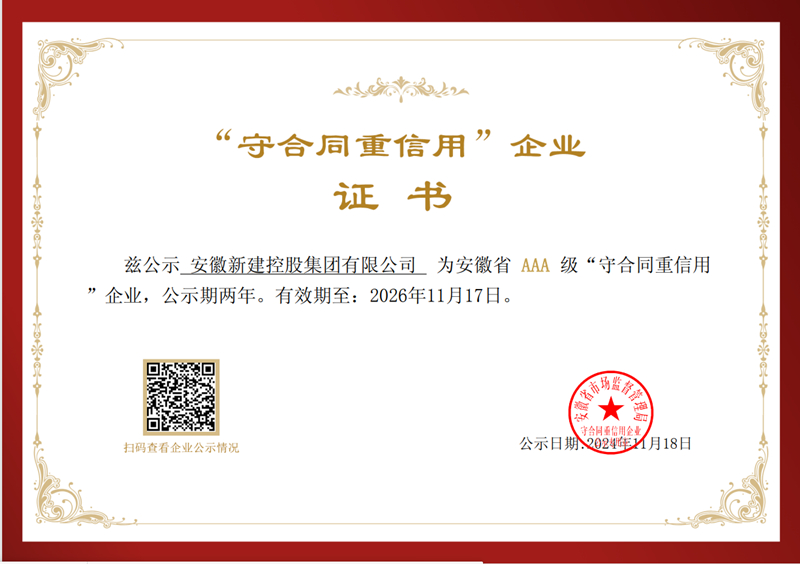 11月18日,安徽省市場監(jiān)督管理局正式公布關(guān)于“安徽省守合同重信用企業(yè)名單”,集團公司獲得頒發(fā)安徽省AAA級“守合同重信用”企業(yè)榮譽證書。