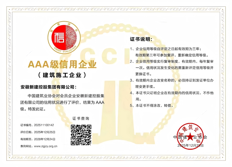 12月25日,中國(guó)建筑業(yè)協(xié)會(huì)公布2025年度建筑業(yè)企業(yè)信用評(píng)價(jià)結(jié)果,集團(tuán)公司順利通過(guò)評(píng)審,再次獲評(píng)AAA級(jí)信用企業(yè),信用等級(jí)為最高級(jí)別。