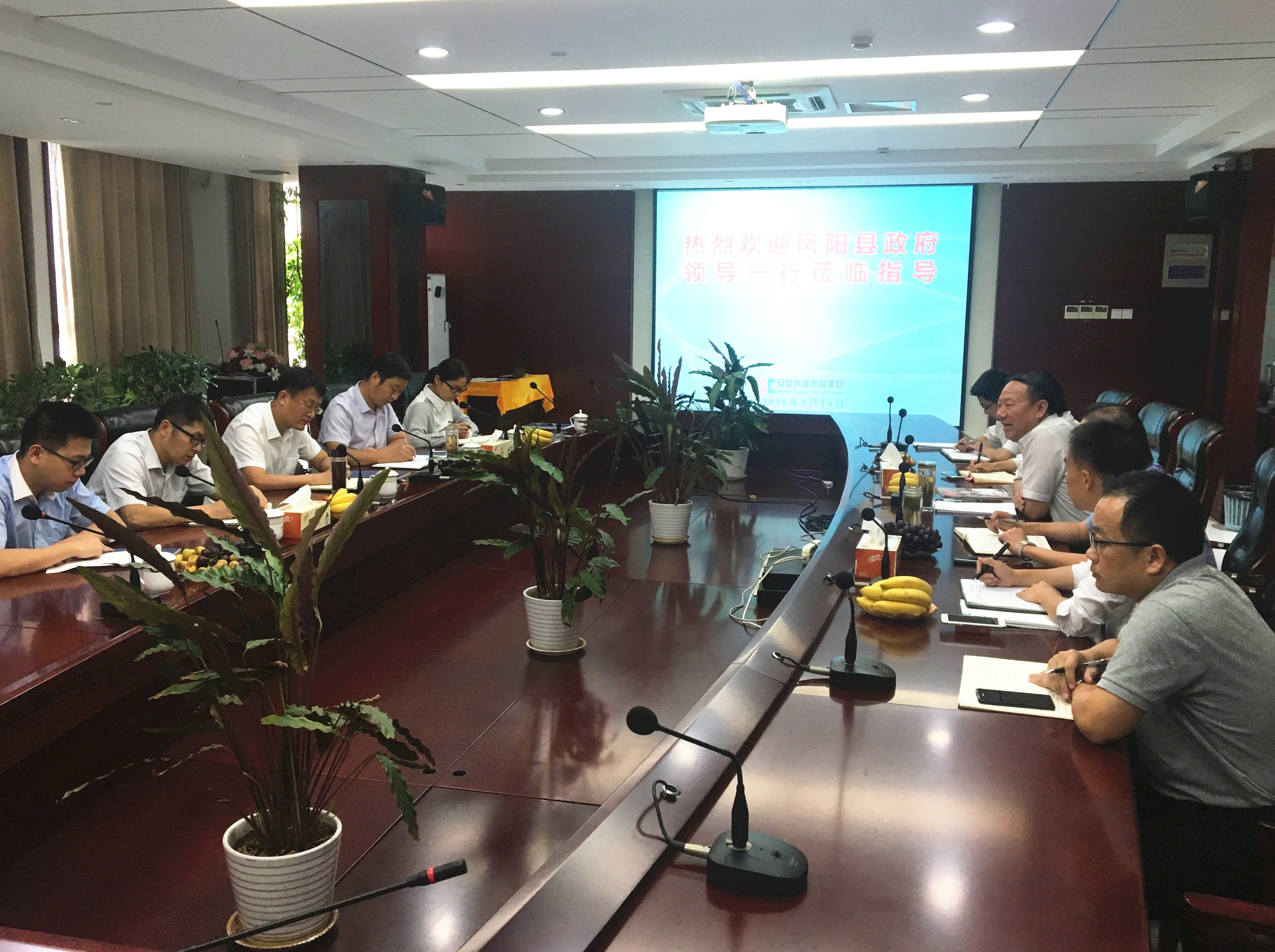 2018年9月18日下午,鳳陽縣重點工程建設管理局局長呂會鵬等一行領導蒞臨我公司考察指導,洽談如意河水環(huán)境綜合治理工程PPP項目的合作事宜。安徽新建控股集團有限公司董事長王杰英、總經理王鵬程等全程參與座談。