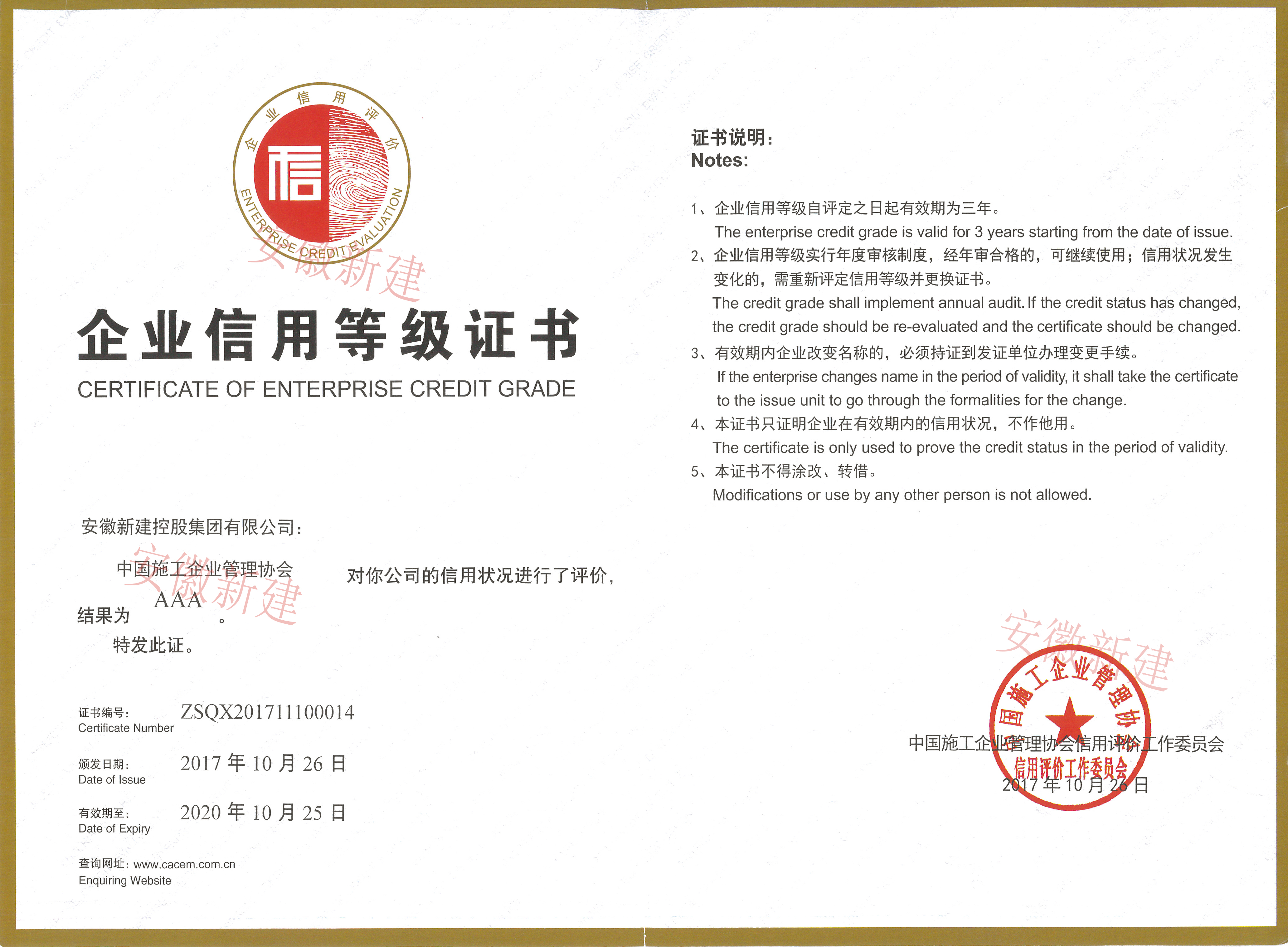 近日,中國(guó)施工企業(yè)管理協(xié)會(huì)公布了2018年度工程建設(shè)企業(yè)社會(huì)信用評(píng)價(jià)結(jié)果,我公司憑借一貫優(yōu)異的信用水平,順利通過(guò)工程建設(shè)企業(yè)AAA社會(huì)信用等級(jí)復(fù)評(píng)審核,該等級(jí)是行業(yè)內(nèi)最高的信用等級(jí)。
