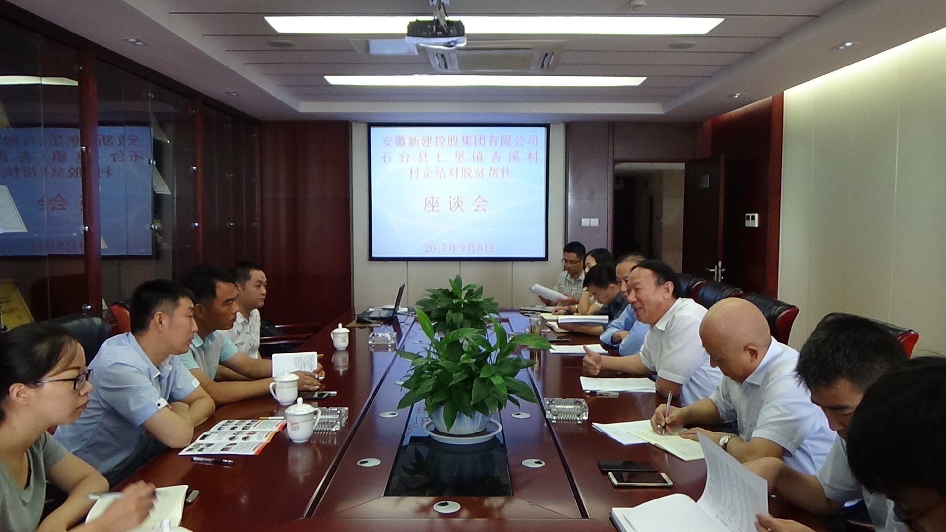 2017年9月8日,我公司村企結(jié)對(duì)脫貧幫扶對(duì)象石臺(tái)縣仁里鎮(zhèn)杏溪村的村委書(shū)記雷霆一行來(lái)我公司座談,安徽新建控股集團(tuán)有限公司董事長(zhǎng)王杰英等相關(guān)領(lǐng)導(dǎo)參加了座談會(huì),雷書(shū)記對(duì)杏溪村的脫貧情況進(jìn)行了詳細(xì)介紹,公司領(lǐng)導(dǎo)對(duì)杏溪村脫貧幫扶給出了初步計(jì)劃和方案,村企雙方對(duì)座談效果感到滿(mǎn)意。