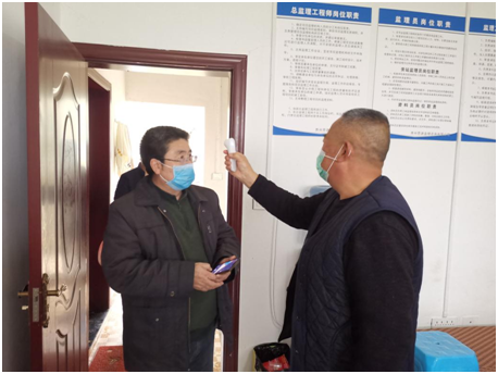 夏局長一行對項目部疫情防控的各項措施落實情況進(jìn)行檢查,并進(jìn)行體溫測量及登記。