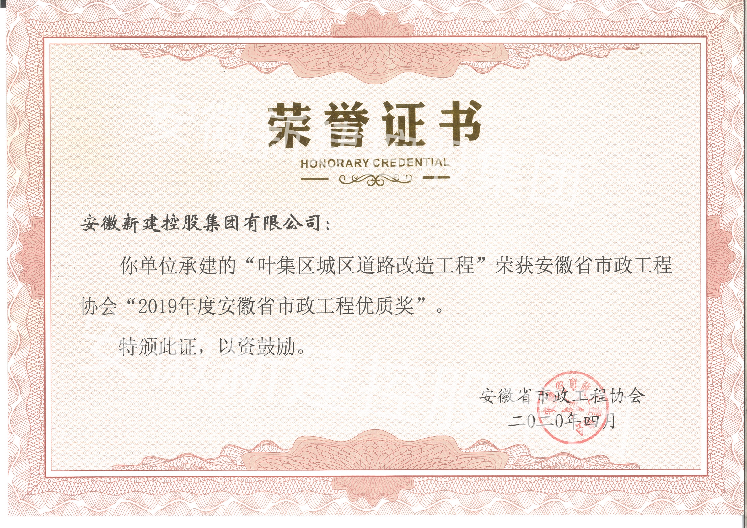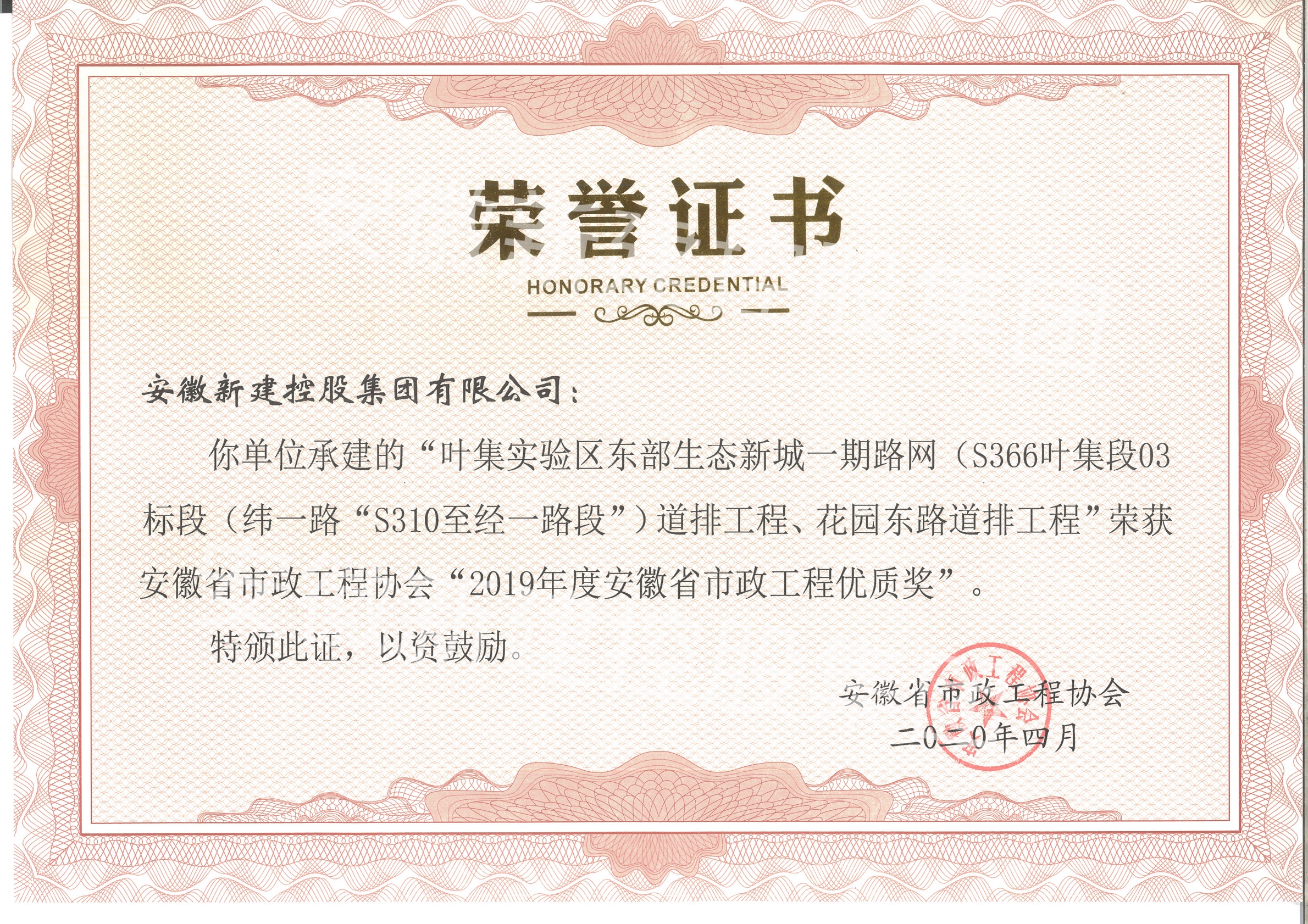 近日,從安徽省市政工程協(xié)會傳來喜訊,由我單位承建的“葉集區(qū)城區(qū)道路改造工程”、“六安市產(chǎn)業(yè)集中區(qū)藍(lán)溪路、前進(jìn)路道路工程”、“鳳陽寧國現(xiàn)代產(chǎn)業(yè)園文賢北路、鳳祥路等三條道路工程”、“葉集實(shí)驗(yàn)區(qū)東部生態(tài)新城一期路網(wǎng)標(biāo)段道排工程、花園東路道排工程”等四項(xiàng)工程榮獲“2019年度安徽省市政工程優(yōu)質(zhì)獎”。